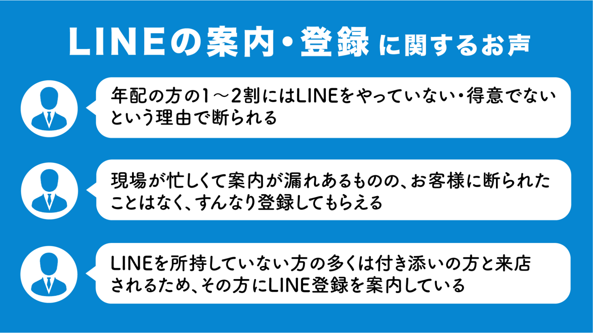 また、ご案内した結果、 8割のお客様にご登録いただけたとのことです。ご案内したものの、登録いただけなかった方は「LINEを使っていないお客様」もしくは「ご年配の方」という回答でした。