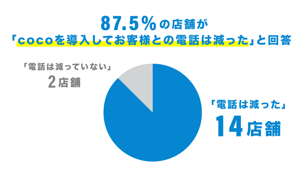 16店舗中14店舗に 「cocoを導入してお客様との電話は減った」と回答いただきました。